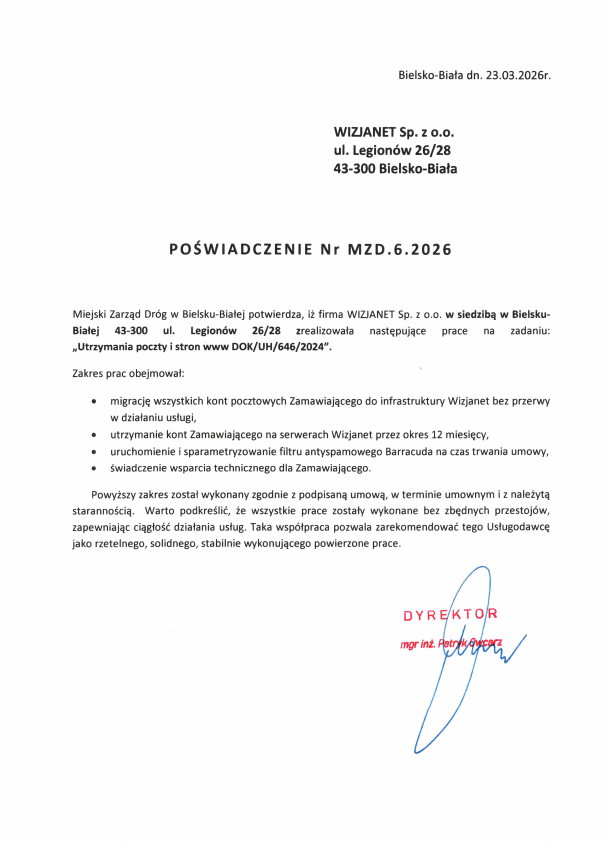 "Prace związane z przenoszeniem skrzynek e-mail przebiegły szybko i bezproblemowo, a pracownicy wykazali się profesjonalizmem i znajomością aspektów technicznych przy wykonywaniu w/w działań".