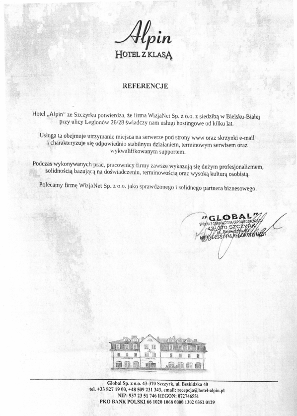 "Od 2004 roku współpracujemy z firmą WizjaNet w zakresie usług hostingowych, aktualizacji stron www oraz działań reklamowych. Zawsze usługi te charakteryzowały się stabilnością działania i profesjonalnym podejściem pracowników do obsługi naszej firmy"